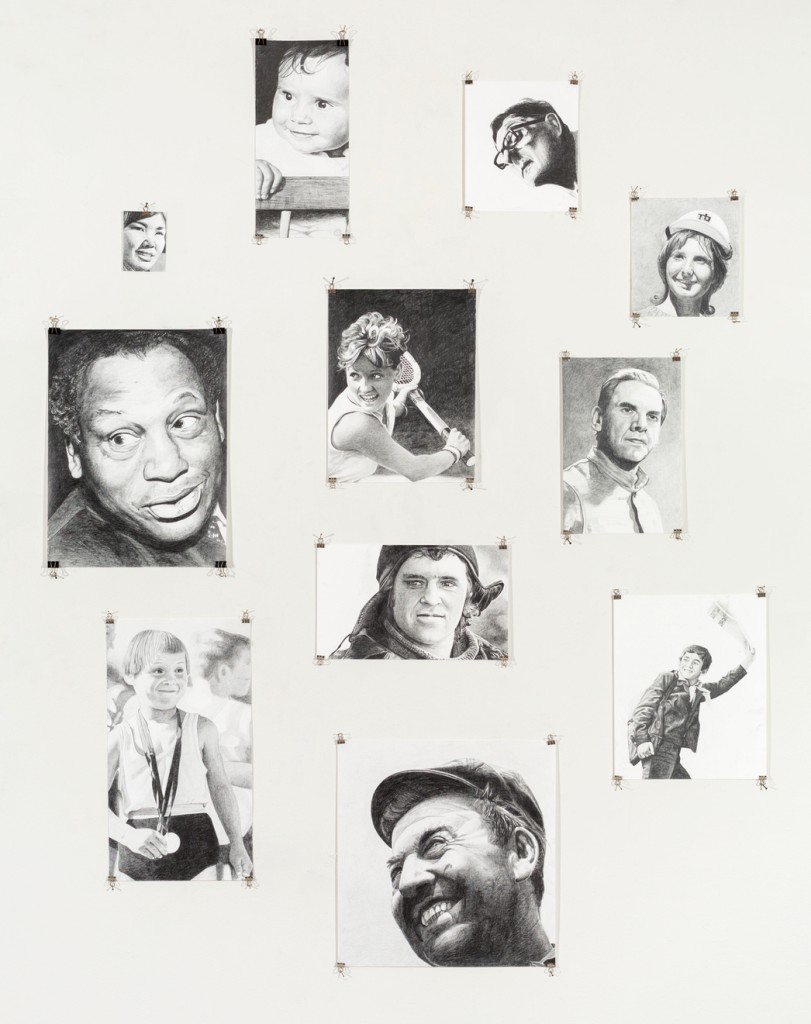After an intensive work period, I no longer found it interesting to continue with collage-like clusters. I had sorted my material. I shifted my focus and began to ponder whether I could capture the tensions of real socialist utopian representation by drawing individual faces, where the model citizen poses as the mannequin of the entire system, smiling, determined, and with a resolute gaze directed towards the future. I started by drawing facial portraits on relatively small sheets of paper. (See Figure 14.)